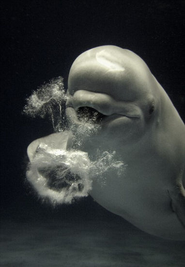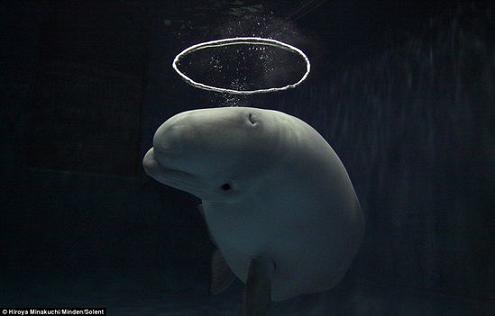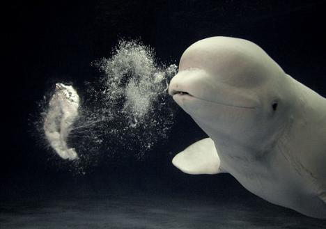 白鯨憨態(tài)可掬,兀自玩耍著一個(gè)圓圈狀水泡